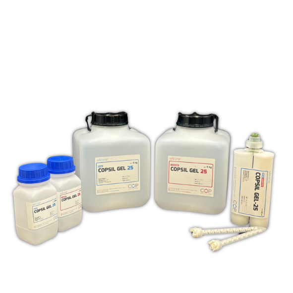 COPSIL GEL 25 er et tokomponentsystem (harpiks og herder) med et blandingsforhold på 1:1. Den herder ved romtemperatur gjennom en polyaddisjonsreaksjon med en platina-katalysator. Varme kan fremskynde polymeriseringen.